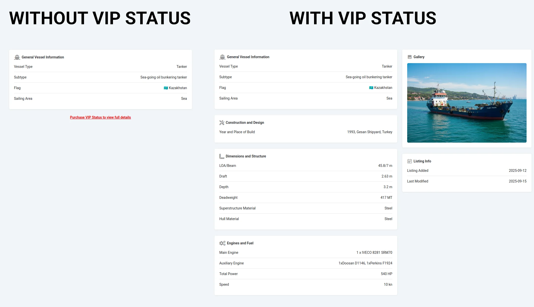 Purchase the annual VIP Status subscription on Fleet-Trade to gain comprehensive access to all vessel listings on our platform. This is an essential tool for professionals engaged in the sale, purchase, and chartering of marine vessels.